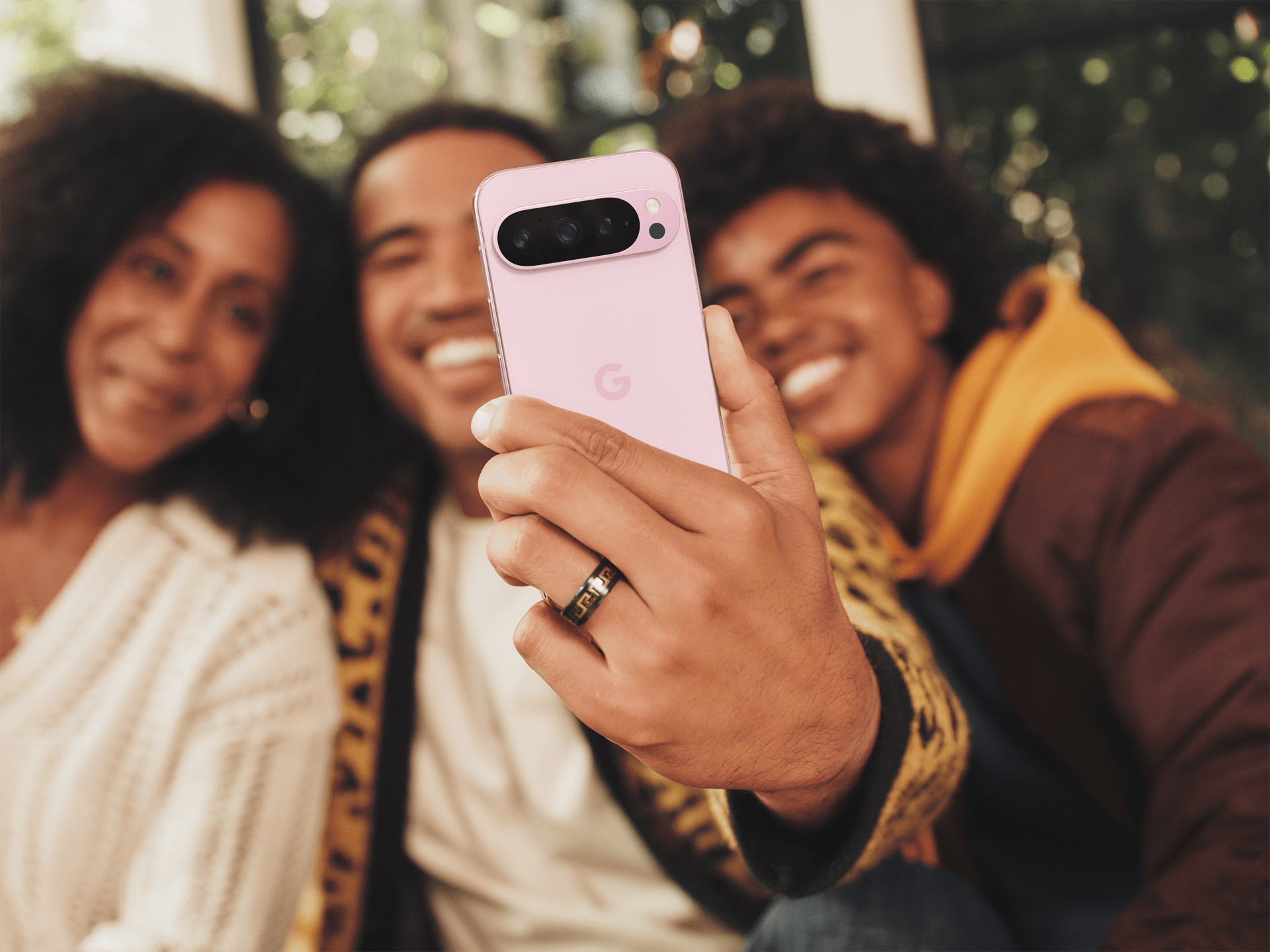 Pixel 9 Pro in Rose Quartz and Hazel.