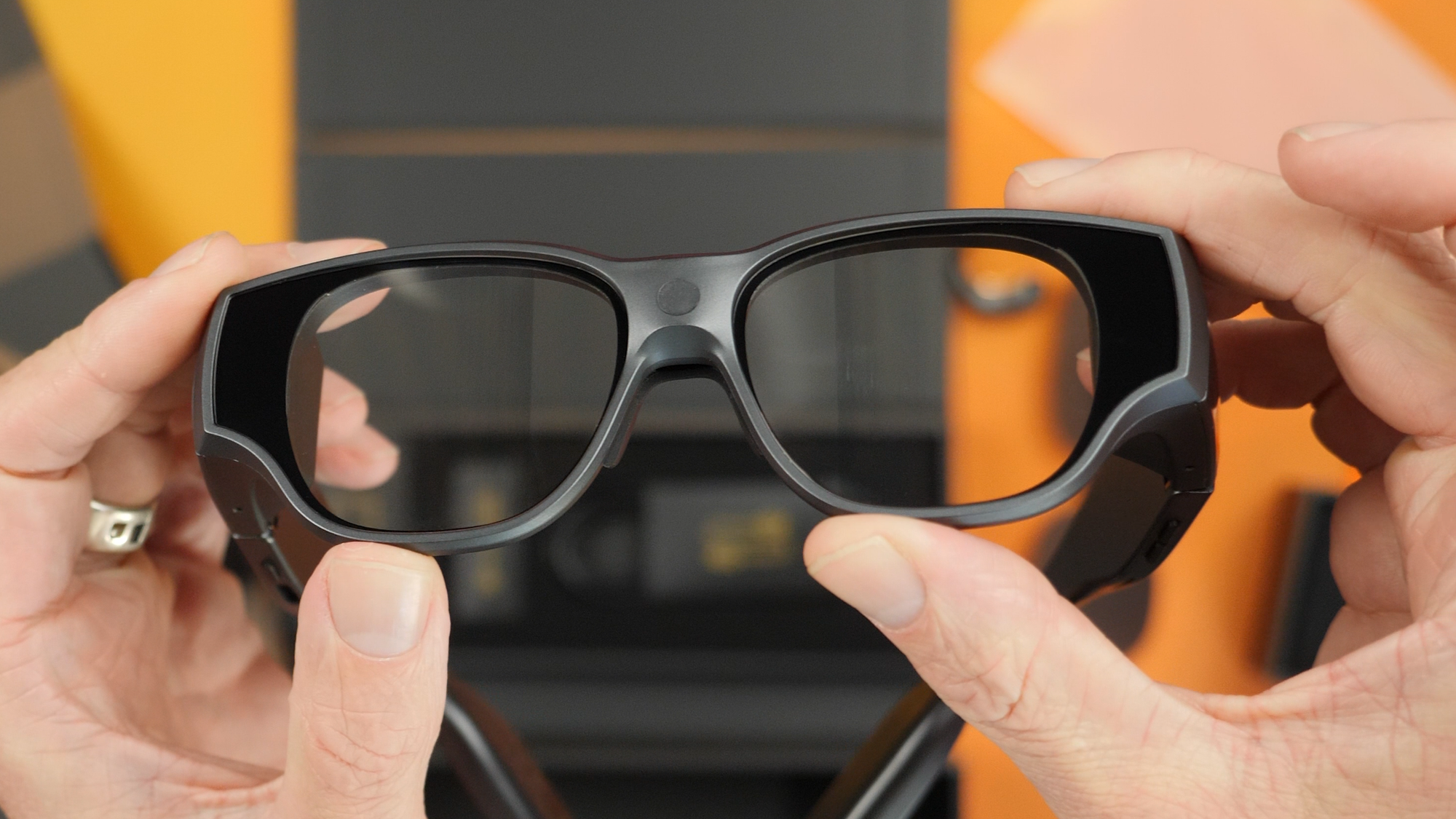 The display itself is the highlight. Indoors, it's bright and vibrant. I noticed that the center of the viewing window is sharper than the side edges. INMO told me this is a symptom of the waveguide technology that they integrated into the lenses, but it's important to mention that I haven't noticed this with other smart glasses like these. Also, the waveguides embedded in the lenses are visible when someone looks at you head-on, further presenting to the world that these are not ordinary glasses.