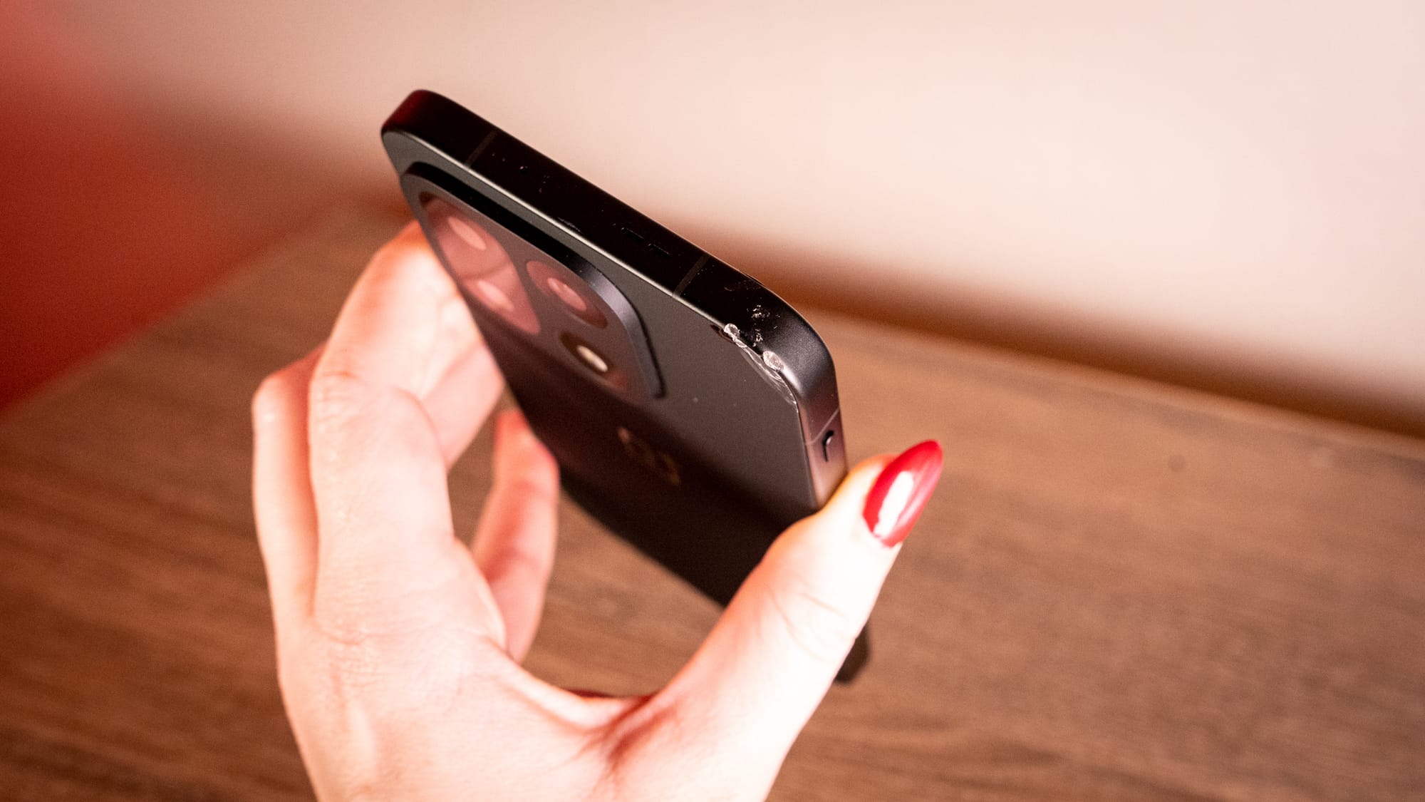 I have already explained what happened, so let's discuss how the OnePlus 15 managed to survive after falling two stories from my balcony and landing on the stone floor. The majority of the damage is on the top left corner of the device. I think what happened is that the corner took the impact of the fall, protecting the screen and camera lenses from getting damaged. OnePlus does say in its reviewer's guide that the frame is treated with aerospace-grade Micro-Arc Oxidation (MAO). You can see in the photos that the corner looks chipped rather than shattered, a testament to the ceramic coating. Additionally, the matte back remains fingerprint-free, which OnePlus heartily promises with the Infinite Black version of the OnePlus 15.