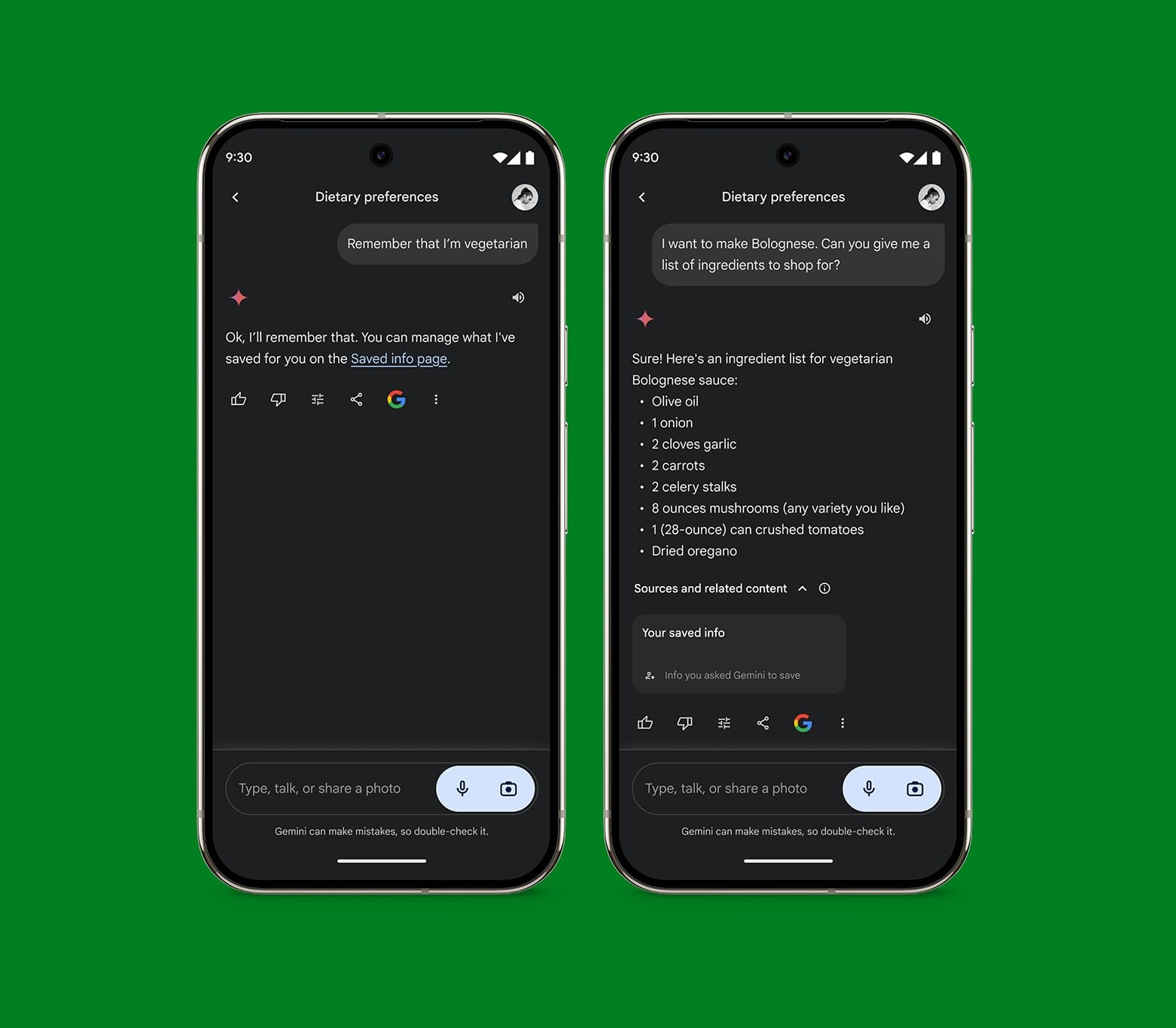 Saved Info with Gemini: You can now ask Gemini to remember your interests and preferences so it can provide more tailored responses. For example, you can tell Gemini that you're a vegetarian so that it'll provide you with vegetarian-friendly recipes in the future without you needing to remind it to do so. You can find, edit, or delete any saved info in Gemini's settings. This feature is available globally in English to users who are 18+ and are subscribed to Gemini Advanced via the Google One AI Premium Plan. You don't need a Pixel phone to take advantage of this feature.