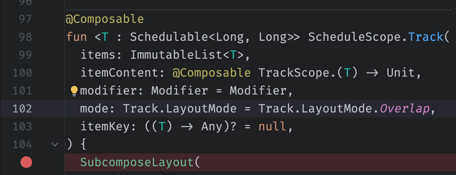 Track recomposes, I'll add a breakpoint to the top of the Track content.Track composable's content.I'll now see this "Recomposition State" section.