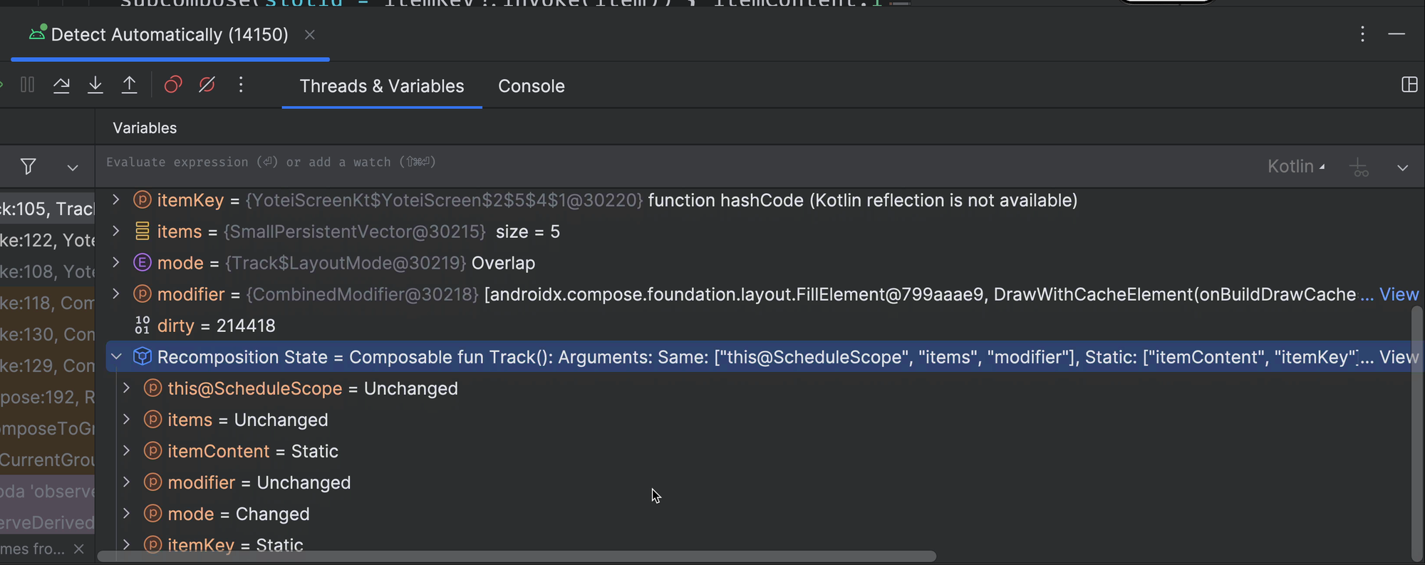 This Recomposition State lists all of the inputs into my composable and the status of those inputs on this particular recomposition. In the above example, the breakpoint was hit after I hit the switch to toggle the layout mode. In the Recomposition State, the arguments into my Track are shown, and as expected, the mode argument is marked as changed.
