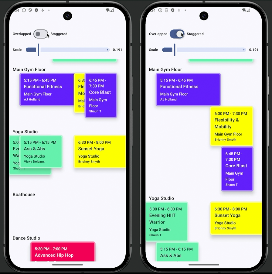 Inside the schedule are multiple tracks with multiple classes in each track, and I can change the layout of classes in each track to be either overlapped (where classes that are overlapping are drawn on top of each other) or staggered (where classes that are overlapping are drawn one after another vertically).
